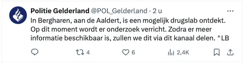 In een pand aan de Aaldert in Bergharen is woensdagmiddag mogelijk een drugslab ontdekt. Op dit moment wordt onderzoek verricht door de politie. De omgeving is afgezet.
