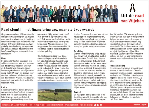De gemeenteraad van Wijchen stemt in met de voorfinanciering van 21 miljoen euro voor de realisatie van het asielzoekerscentrum (azc) aan de Teersdijk. Wel stelden de fracties tijdens de raadsvergadering van donderdag 26 september een aantal eisen aan de afspraken met het Centraal Orgaan opvang Asielzoekers (COA).