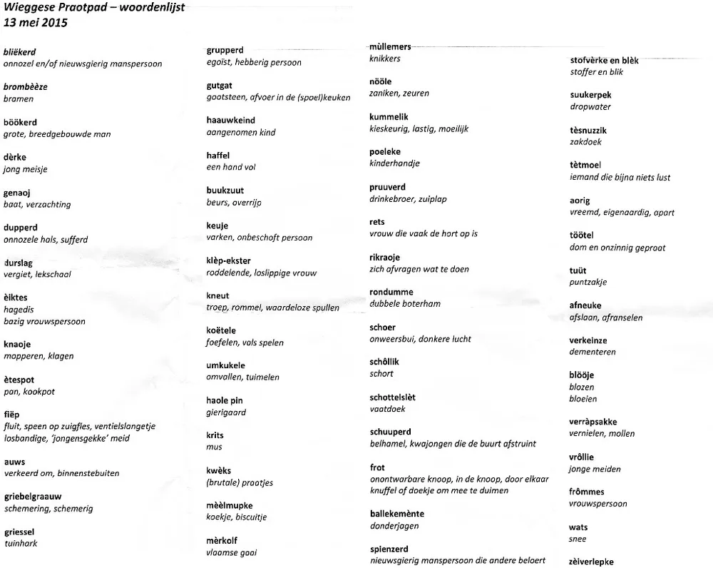 Wethouder Paul Loermans opent zijn toespraak met: "Als echte Wijchense gaan we hier het Wieggese Praotpad openen. Bij mijn ouders en op de Franciscusschool mocht ik geen dialect spreken, vandaar dat bij mij het Wijchense dialect niet zo heel goed gelukt is. Daarom ben ik zo blij dat het initiatief genomen is om het Wijchense toch te bewaren via de tegels met de Wijchense spreuken. Dit initiatief is ontstaan door de werkgroep met o.a Toon de Hair, Jos van der Knaap en directeur Anja Kaashoek van de Bibliotheek en taalmeesters Pedro Willems en Urial Schuurs. Het is belangrijk dat we met zijn allen het Wieggese dialect bewaren, om dat door te geven aan de volgende generatie al denk ik niet dat de jeugd het zal gaan spreken."