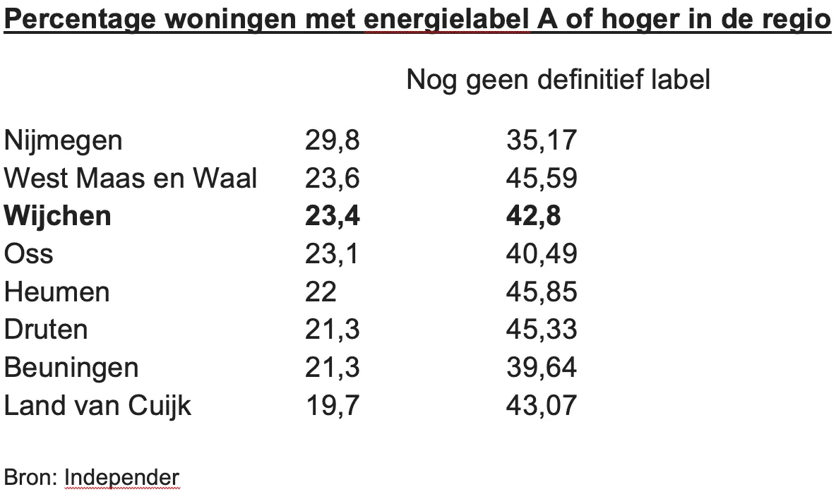 In de gemeente Wijchen heeft bijna kwart van de woningen, 23,4 procent, energielabel A of hoger. Dat is meer dan het landelijk gemiddelde: 21,5 procent. Dat is landelijk wel een verdubbeling ten opzichte van 5 jaar geleden. Dat blijkt uit onderzoek van Independer op basis van de energielabelregistratie van de RVO.