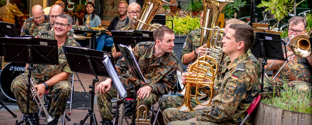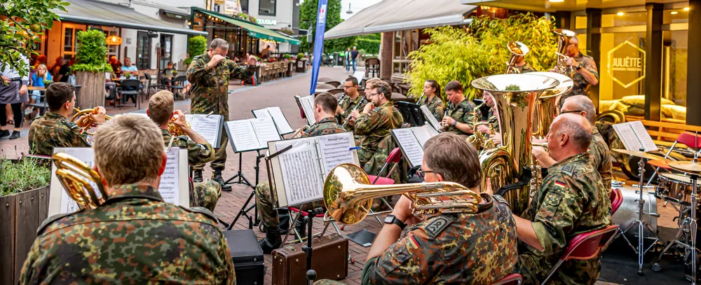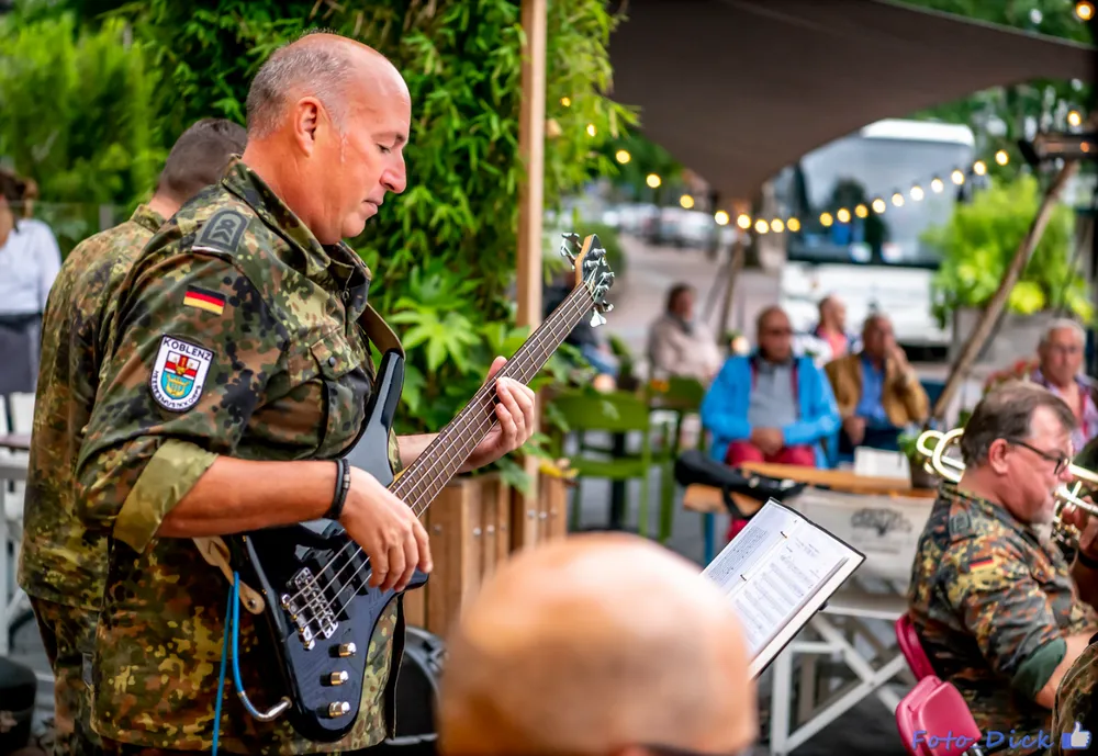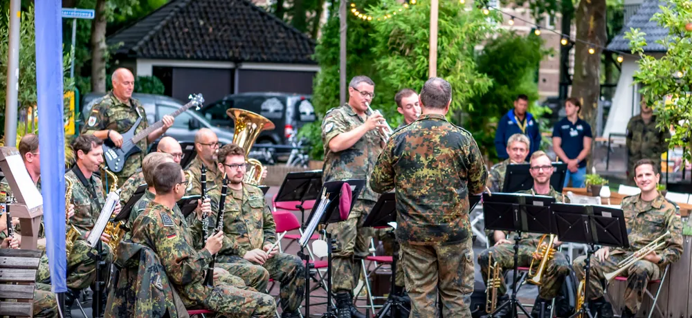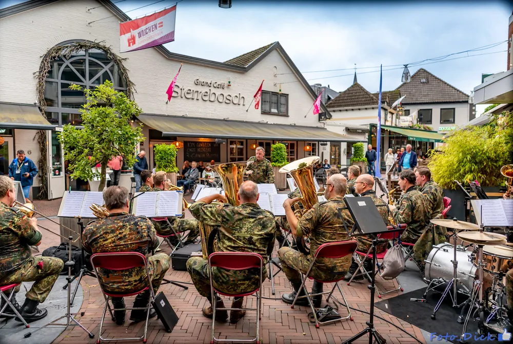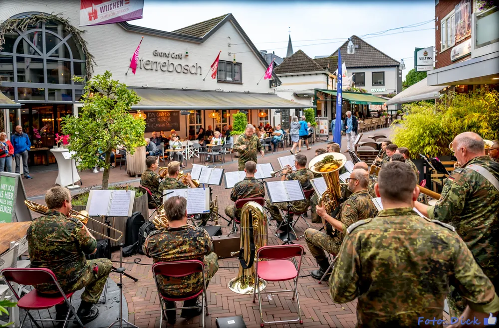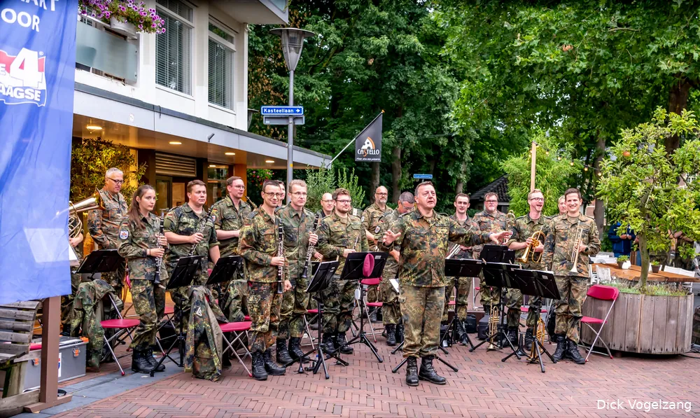 De Vierdaagse vindt vandaag zijn glorieuze slot met de intocht van de tienduizenden wandelaars op de Via Gladiola in Nijmegen. De Dag van Wijchen was dit jaar de eerste wandeldag omdat de dinsdagetappe was geschrapt. Het Vierdaagsefestijn in Wijchen werd donderdagavond besloten met een optreden van het Heeresmusikkorps Koblenz. Voor Grand Café Sterrebosch werden de vele toehoorders onthaald op muzikale klanken. Fotograaf Dick Vogelzang was erbij en maakte deze foto's. Meer foto's zijn te zien op zijnpagina op Flickr.