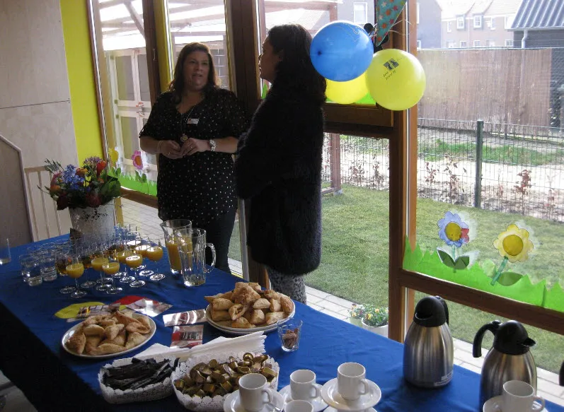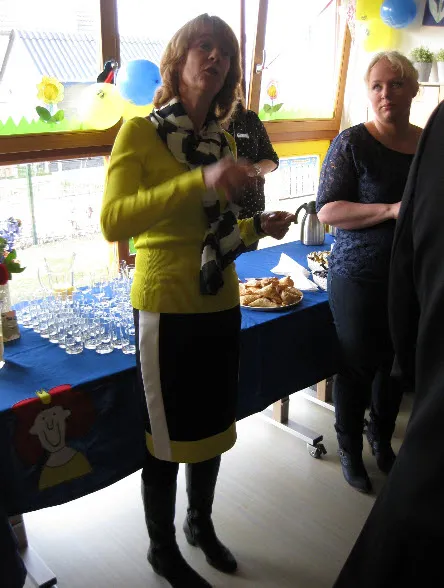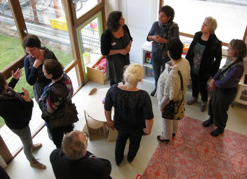 Daarna volgde een rondleiding met uitleg over de opzet van de kinderopvang vooral wat betreft de bouw en inrichting daarvan. Het gebouw is ontworpen en ingericht volgens de nieuwste inzichten op het gebied van kinderopvang. De lokalen hebben ieder een eigen kleur voor de herkenning door de kinderen. Zo zijn er veel geluiddempende materialen toegepast en is er ook gedacht aan duurzaamheid en vooral veiligheid voor kinderen.