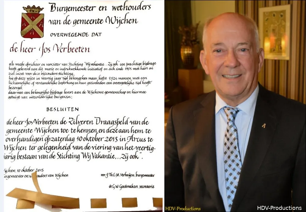 Na de opening door Jo Toonen werd het woord gegeven aan Jos Verbeeten, die, enigszins geëmotioneerd, het mooie relaas van deze stichting vertelde. Daarna kreeg de burgemeester Hans Verheijen het woord. Hij riep herinneringen op aan 1975, het jaar waarin ook een zekere Bill Gates zijn bedrijf begon en idem Steve Jobs. Beiden hadden een gemeenschappelijk doel: verbinden (van mensen door computers). Dat verbinden was al bekend in Wijchen, onder andere door de Stichting “Wij vakantie…. Zij ook”. Die maakte het mogelijk, dat mensen ondanks beperkingen toch van vakantie konden genieten. De doelstelling van de stichting is immers: “Het stimuleren en, waar nodig, financieren van passende vakanties voor geestelijk en lichamelijk gehandicapten uit de gemeente Wijchen.” Volgens de burgemeester had Wijchen dus al veel eerder het begrip participatiesamenleving uitgevonden. Jos Verbeeten werd voor zijn inzet (al de jaren voorzitter geweest…) onderscheiden worden met de zilveren draagspeld van de gemeente Wijchen.