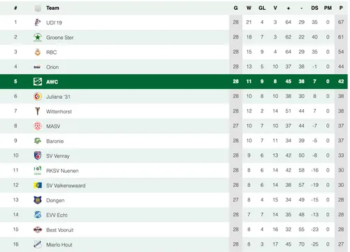 Door zelf te winnen bij SV Venray en verlies van Orion bij Groene Ster is AWC de Nijmeegse ploeg tot op 2 punten genaderd en dus volop in de race om als vierde te eindigen in de vierde divisie C.