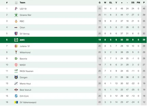 AWC schuift met dit gelijkspel op naar de zesde plaats in de vierde divisie C op een punt van SV Venray en 3 punten van Orion. De Wijchenaren hebben echter nog een wedstrijd tegoed. AWC gaat komende zondag op bezoek bij RKSV Nuenen.