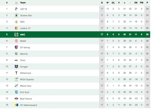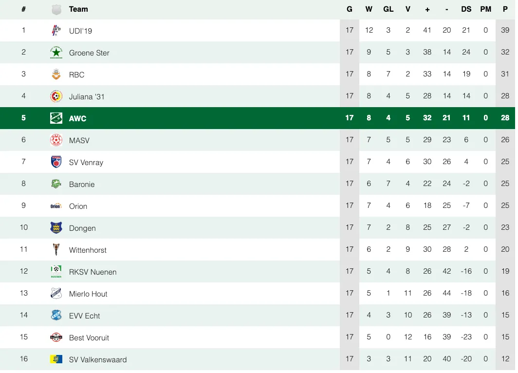 Na deze overwinning blijft AWC vijfde in de vierde divisie C, met een gelijk puntenaantal als Juliana’31 dat verloor van RBC. Die ploeg staat met 31 punten derde. Komende zondag (14.00 uur) speelt AWC thuis; tegenstander is dan datzelfde RBC.