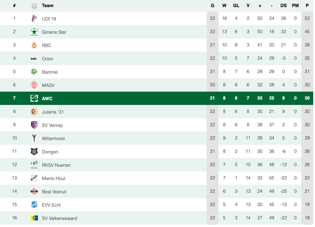 AWC blijft dus ook na het afgelopen weekend verstoken van een zege; de laatste overwinning van AWC dateert van eind januari toen Mierlo Hout werd verslagen. Door de nederlaag tegen UDI’19 zakken de Wijchenaren naar de zevende plek in de vierde divisie C. Komende zaterdag gaat AWC op bezoek bij Best Vooruit.
