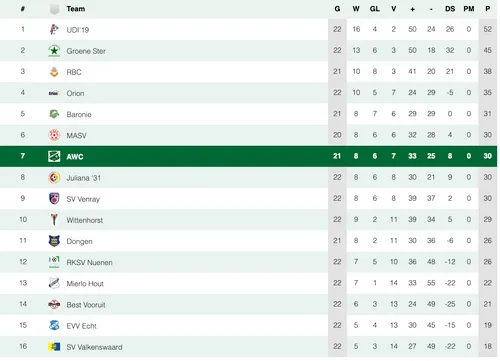 AWC blijft dus ook na het afgelopen weekend verstoken van een zege; de laatste overwinning van AWC dateert van eind januari toen