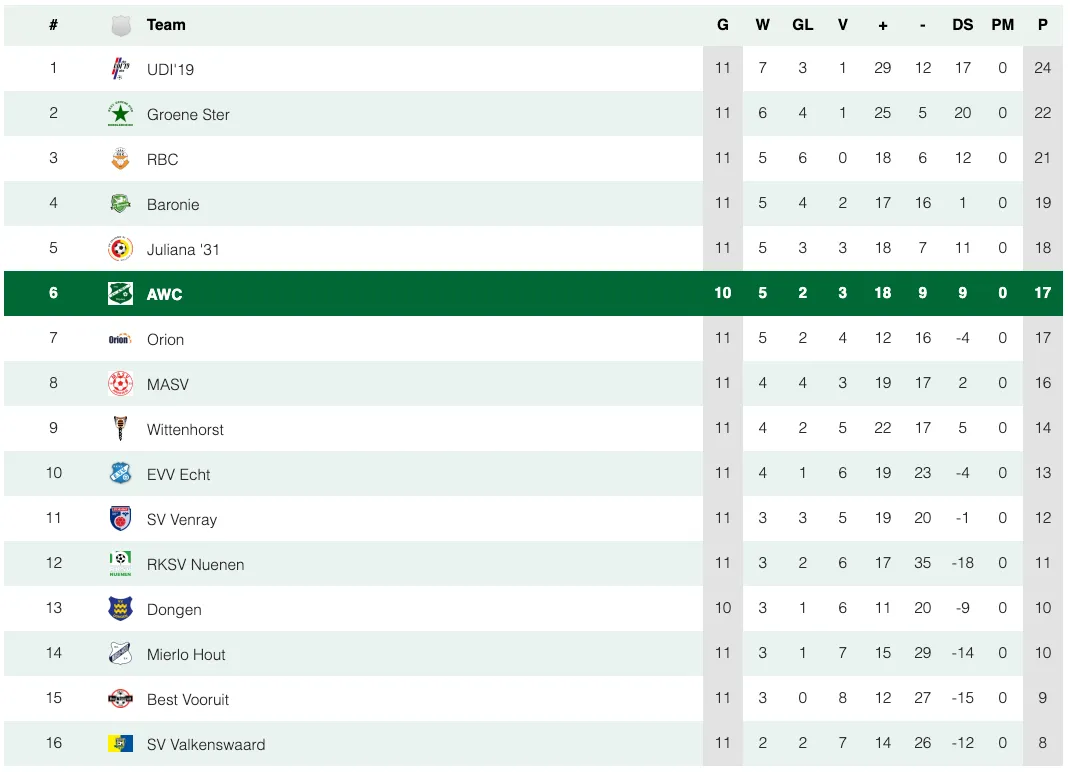 Na deze nederlaag moet AWC even afstand nemen van de top 3. Komende zondag, 17 november, staat een uitwedstrijd tegen SV Valkenswaard op het programma. Die ploeg staat onderaan in de vierde divisie C, maar dat zegt in deze competitie niet zoveel.