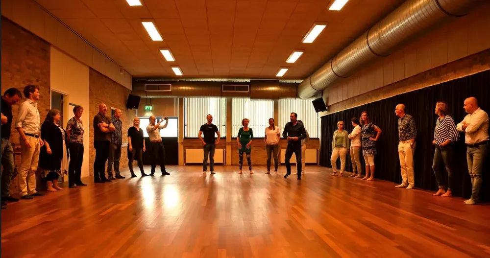 Na een korte intro van Koen vroeg hij ons allen hem te volgen naar de danszaal in ’t Mozaïek, de stemming zat er door het enthousiasme van de spreker al goed in, maar dit was wel even wennen. Schoenen uit, op sokken de zaal in en zien wat er gebeurd, zo dachten de ondernemers. Koen heeft na een goede opwarming en het losmaken van de spieren er voor gezorgd dat (bijna) iedereen uit de welbekende comfortzone kwam. Daarna werden er 2 cirkels van mensen gemaakt, de binnenring liep rond, moest op onverwachte momenten stoppen en vervolgens met degene waar je voor stopte een heel kort gesprek aangaan. Koen veranderde het onderwerp per keer, zaken als ‘stel jezelf voor’, ‘wat doe je’, ‘waarom ben je goed in wat je doet’ kwamen daar aan bod.